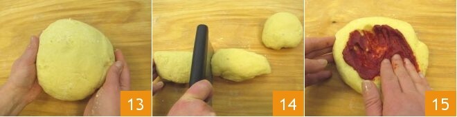 to obtain a homogeneous and compact dough 13 that you will divide with a dough cutter into three equal parts of about 14.8 oz each 14. In one piece, add the tomato paste 15