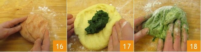 knead with very little flour until you get a uniform color 16. Set aside for a moment, sprinkle the work surface again with very little flour, and add the spinach puree to another piece of dough 17, knead until it takes on a nice uniform green color 18.