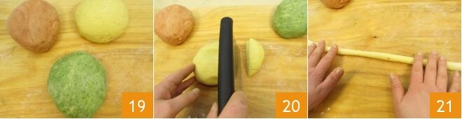 This way, you will obtain three different colors: white, red, and green 19. Take a piece of dough and divide each dough into pieces 20 from which to make logs 0.4 inches thick 21,