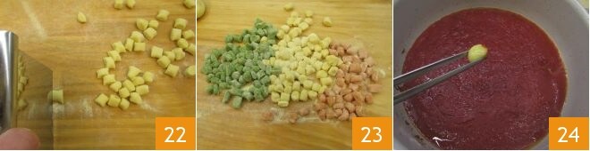 cut them into pieces of about 0.6 inches with a knife (slightly floured) or a dough cutter (22-23) and place them on a tray floured with re-milled semolina flour to prevent them from sticking together. Meanwhile, your tomato sauce will be cooked, remove the garlic clove 24 with kitchen tongs