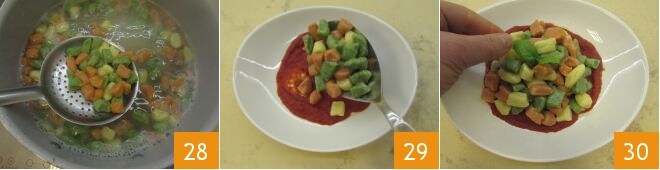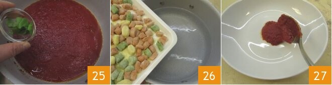 and scent with fresh basil leaves 25. Bring a pot full of salted water to a boil, then cook the tricolor potato gnocchi for a few minutes 26: they will be ready when they float to the surface. While the gnocchi are cooking, pour a base of tomato sauce into the serving plates 27;