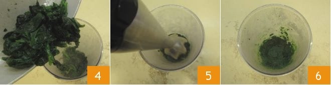 Once cooked, put them in a blender cup 4, blend them with an immersion blender 5 until you obtain a puree 6 which you will set aside.