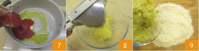 Now take care of the sauce: heat the oil in a pot with a garlic clove, then add the tomato purée 7 and cook for about 30 minutes on low heat, stirring occasionally. While the sauce is cooking, take the cooked potatoes, mash them with a potato ricer while still hot with the skin on (or peeled as you prefer), and collect the puree in a bowl 8. On a work surface, pour the flour (you can hold back a bit from the indicated amount and add as needed: for these doughs, in fact, you need to adjust by eye, as the absorption level of the flour used may vary or depending on the type of potatoes chosen), add the still hot potato puree 9,