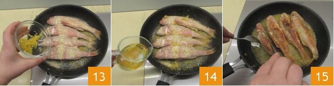and the grated lemon zest 13, then season with salt and pepper. At this point, deglaze with Vernaccia di Oristano DOC 14 and, once it has evaporated, turn the red mullets to the other side using a spoon or fork 15.
