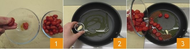 To prepare red mullet with Vernaccia, first wash the cherry tomatoes and crush them with your fingers into a bowl to release the juice and seeds 1. Pour about 1.4 tbsps of oil into a non-stick pan, add the garlic clove 2, and let it flavor for 1 minute, then add the cherry tomatoes with their juice 3, season with salt and pepper.