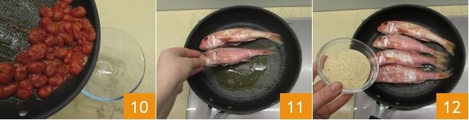 Once the tomato cooking time has elapsed, transfer them to a bowl 10 and pour the remaining oil into the same pan. Lay the red mullets in the pan 11, raise the heat to medium-high, and sprinkle with breadcrumbs 12
