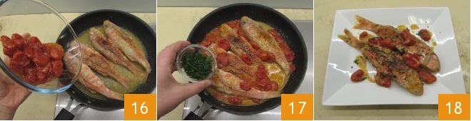 Cook for a couple of minutes, then add the cherry tomatoes 16, lower the heat and let simmer gently for 4-5 minutes. At the end of cooking, add a fragrance with chopped parsley 17 and serve your red mullet with Vernaccia hot 18!