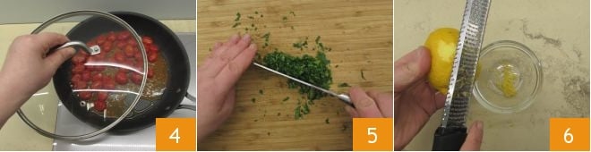 Cover with a lid 4 and cook over medium heat for about 15 minutes. Meanwhile, prepare the rest of the ingredients: chop the parsley 5, grate the lemon zest 6 and set aside.