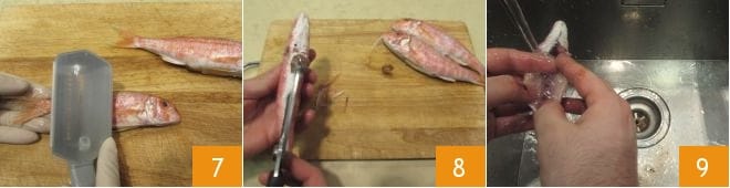 Scale the red mullets 7, then cut the belly with a knife 8 and rinse them under running water to remove the entrails 9: in total, you should obtain about 1.4 lbs of cleaned red mullets.