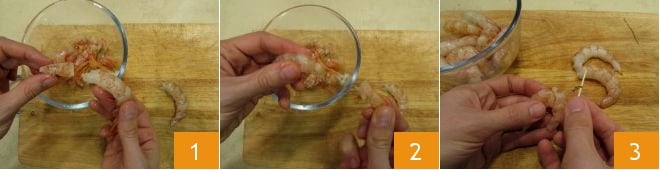 For the 4 shrimp tartare canapés: clean the shrimp by shelling them (1-2), then cut along the back and remove the intestine, the black thread, perhaps using a toothpick 3: repeat this operation for the shrimp quantity for the entire recipe.