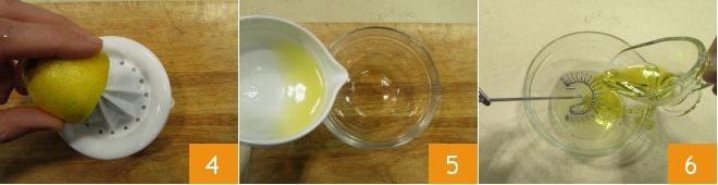Squeeze the lemon juice and pour it into a small bowl (4-5); also add the oil in a thread, emulsifying with a hand whisk 6. Add salt and pepper to taste.