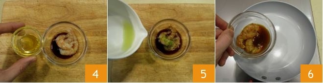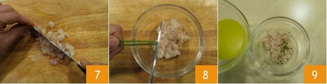 Then chop 4 of the cleaned shrimp 7 and place them in another small bowl; chop the chives 8 and add the oil and lemon emulsion to the chopped shrimp 9. Set aside in the fridge covered with plastic wrap until ready to use.