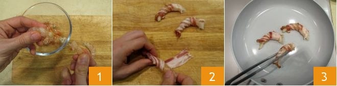 For the 4 shrimp and bacon canapés: after shelling the shrimp 1, wrap them in bacon slices 2 and sear them for 1 minute per side in a non-stick pan 3 so that the bacon becomes crispy on the outside.