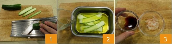For the 4 zucchini and shrimp canapés: wash and trim the zucchini, then slice it with a mandolin to obtain 4 fairly thin slices 1; place them in a deep-bottomed baking dish and marinate them with oil, apple cider vinegar 2, salt, and pepper. After 10-15 minutes, you can drain the zucchini well and set them aside. Meanwhile, also prepare the shrimp: place 4 shrimp tails in a small bowl, add the soy sauce 3
