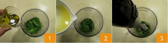 For the accompanying sauces, start with the basil reduction: place the basil leaves, add salt, oil 1, and lemon juice 2; then blend everything with an immersion blender 3.