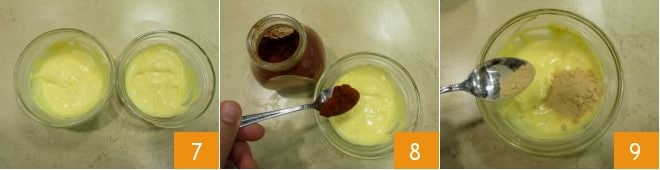 Divide the obtained mayonnaise into two small bowls 7 and flavor one with paprika 8 and the other with powdered ginger 9.