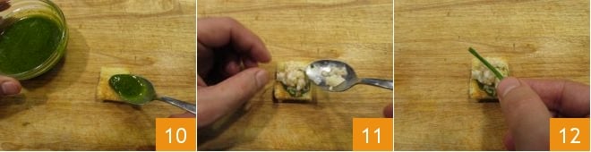 For the 4 shrimp tartare canapés: you can decide to further divide the brioche bread by making small squares, then sprinkle the toasted surface with the basil reduction 1, add the tartare 2, and decorate with a piece of chive 3.