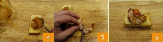 For the 4 shrimp and bacon canapés: spread the brioche bread with paprika mayonnaise 4, you can divide the shrimp if you prefer 5, and place them on the brioche bread 6.