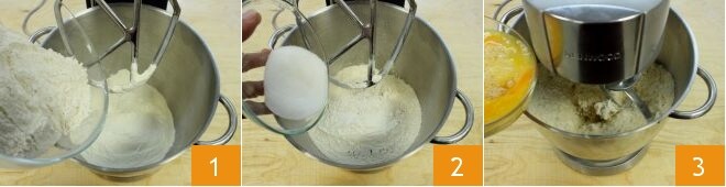 To make the trio of brioche bread canapés with shrimp, start with the brioche bread: pour the sifted flours into the bowl of a stand mixer fitted with a paddle attachment 1. Add the dry yeast (you can also use fresh yeast: in this case, use 6 g), the sugar 2, and the eggs a little at a time 3.