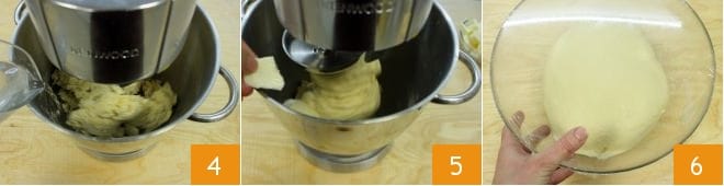 Add the water at room temperature 4, then activate the paddle at medium speed. When the ingredients are well gathered around the paddle, stop the mixer, replace the paddle with the hook, and turn the machine back on; add the salt and softened butter at room temperature in small pieces, a little at a time 5, waiting for one piece to be absorbed before adding another. Knead the dough with the hook until it is smooth and homogeneous. Transfer the dough to the work surface and shape it into a spherical form. Place it in a large bowl, cover with plastic wrap 6, and let it rise for at least 30 minutes in the oven turned off with the light on.