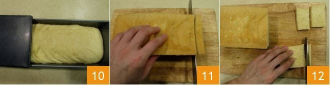 After the necessary time, close the mold with the appropriate lid to obtain a more rectangular shape (otherwise leave it uncovered and the brioche bread will have more push during baking, it will rise higher) 10. Bake in a preheated static oven at 338°F (170°C) for 30 minutes (if using a fan oven, bake at 302°F (150°C) for 20 minutes). Once baked, take it out and let it cool slightly, then remove it from the mold and let it cool completely on a wire rack. Once cold, slice it into slices 0.6 inches (1.5 cm) thick 11, cut off a side strip to form a rectangle 12