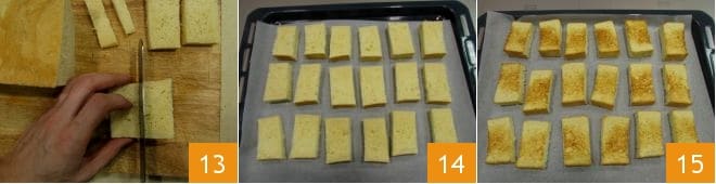 then divide it into two 13: you will need 12 in total (with the leftover brioche bread, you can make Toasted bread slices or delicious croutons to serve with a soup, for example!). Place them on a baking sheet lined with parchment paper 14 and toast them under the grill at 464°F (240°C) for three minutes (make sure the brioche bread rectangles turn golden without burning, you can turn them halfway through cooking) 15. Once ready, take them out and let them cool.