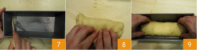 Brush a 10.2x4.5 inch rectangular mold with butter 7. Then take the dough and handle it briefly, making folds 8, and form a loaf of the same dimensions as the mold. Place the brioche bread in the mold 9 and allow it to rise for another 30 minutes covered with plastic wrap (alternatively, you can brush it with beaten egg mixed with a tablespoon of milk).