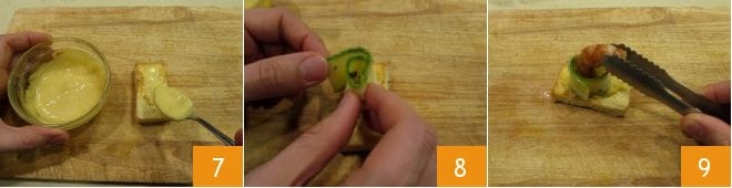 For the 4 zucchini and shrimp canapés: spread the brioche bread with ginger mayonnaise 4, create a zucchini rose by rolling the slice vertically 5, and place the caramelized shrimp on top 6. Or simply wrap the shrimp tail with the zucchini slice.