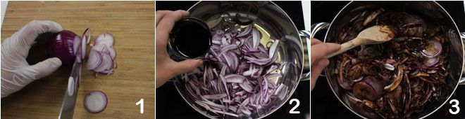 To prepare the Tropea onion compote with balsamic, start by cleaning the onions: wash, trim, and slice the onions 1 (for this operation, we recommend using disposable gloves to avoid the onion smell on your hands). Take a saucepan, add the onions and balsamic vinegar 2, then let them soften for 10 minutes on low heat, stirring frequently 3.