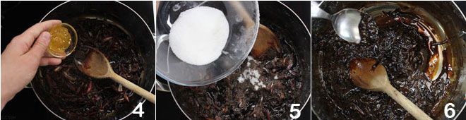When the onions are softened, add the honey 4 and sugar 5 and let cook for about 45 minutes on very low heat, continuing to stir often 6; check that the compote remains soft and does not tend to "caramelize." After the indicated time, check the cooking by performing the saucer test: pour a teaspoon of Tropea onion compote with balsamic on a tilted saucer, it will be ready if it does not tend to drip but remains rather compact and homogeneous; otherwise, let it cook a little longer.