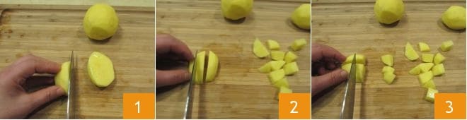 To prepare the tuna fillet with pistachio pesto, first preheat the oven to 392°F in static mode, then wash and peel the potatoes with a peeler. Cut the potatoes in half lengthwise 1, then slice them lengthwise 2 and crosswise to obtain cubes about 0.4 inches in size 3.