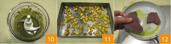 and blend until you obtain a smooth cream 10. Then, transfer the pistachio pesto into a bowl and set aside. When the potatoes are golden brown, remove them from the oven 11 and proceed with cooking the tuna: heat a drizzle of oil in a non-stick pan, then add the tuna fillets 12,