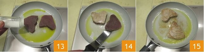 add salt 13 and pepper, and cook over medium-high heat for 2-3 minutes. At this point, gently turn the tuna fillets with a spatula 14 and cook the other side for 1-2 minutes 15, then remove them from the pan.