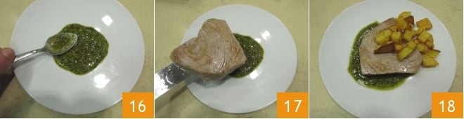 Place a spoonful of pistachio pesto on each plate 16, lay the tuna fillet on top 17, and add the golden potatoes. Your tuna fillet with pistachio pesto is ready to be served 18!