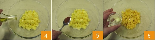 Transfer the cubed potatoes into a bowl, add the oil 4, salt, paprika 5, garlic cloves 6, and mix thoroughly.