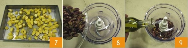 Pour the seasoned potatoes into a baking tray 7 and bake in the preheated static oven at 392°F for about 30 minutes. Meanwhile, proceed with preparing the pistachio pesto: place the shelled pistachios in a food processor 8, add the oil 9 and a pinch of salt,