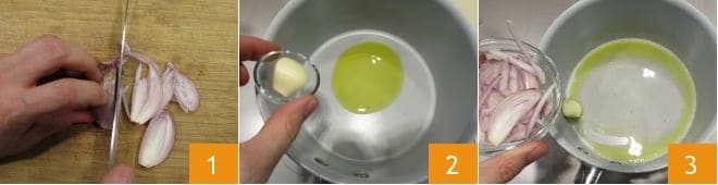 To make the tuna fillets on chickpea and red onion velouté, first start with the chickpea cream: clean and slice the shallot 1. Heat 2 tsp of olive oil in a saucepan, add 1 peeled but whole clove of garlic 2 and the sliced shallot 3.