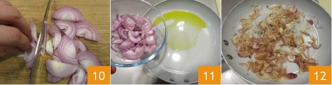 Meanwhile, clean the red onion and slice it 10, in a pan heat 2 tsp of olive oil and add the sliced onion 11, sauté over medium-high heat for about 5 minutes or until well golden and crunchy 12; stir occasionally and salt at the end of cooking.