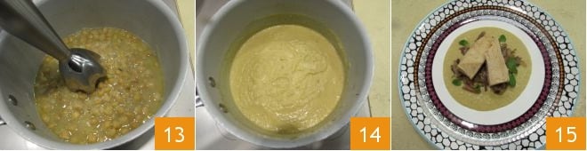 Meanwhile, the chickpeas will have finished cooking, blend them with an immersion blender 13 to obtain a smooth and lump-free cream 14. Assemble your dish by spreading a layer of chickpea cream on the bottom, then a layer of onions toasted in the pan, and finally lay the drained tuna fillets on top, finish with pepper to taste and some dill leaves. Distribute the ingredients evenly on the 4 serving plates: the tuna fillets on chickpea and red onion velouté are ready to be served 15!