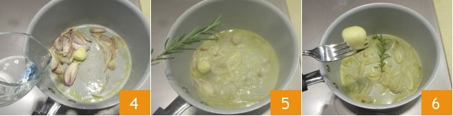 Moisten with a little water 4, flavor with a sprig of rosemary 5 and let the shallot wilt for about 5 minutes over moderate heat, stirring occasionally. Remove the clove of garlic 6