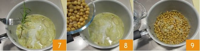 and the sprig of rosemary 7, salt, pepper, and pour in the chickpeas 8, add water 9 until they are covered and continue cooking for about 20 minutes or until the chickpeas are very tender.