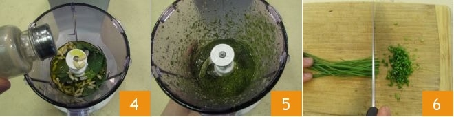 Salt and pepper 4, then turn on the mixer to obtain a smooth sauce 5. Now focus on the marinade: chop the chives 6