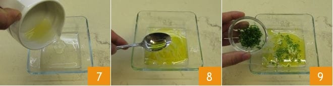 in a bowl, pour the lemon juice 7, the olive oil 8, the minced garlic clove, and the chives 9,