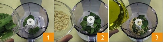 To prepare the tuna steak with mint pesto, start by making the mint pesto: in the bowl of a mixer, place the well-washed and dried mint leaves 1, add the pine nuts 2 and the olive oil 3