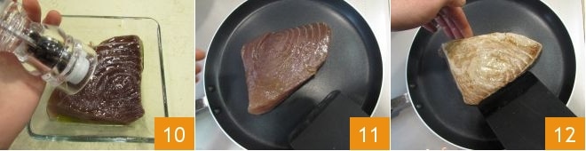place the tuna, massage it with the marinade on both sides so it absorbs the flavor and season with pepper 10. Let it marinate for half an hour. Now proceed to cooking: heat a non-stick pan well, place the tuna 11 and sear it for one minute on each side 12.