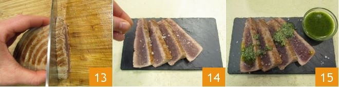 Once cooked, cut the tuna into slices ¾ inch thick 13. Place the tuna slices on a plate, season them with coarse salt 14 and accompany your tuna steak with the mint pesto 15.