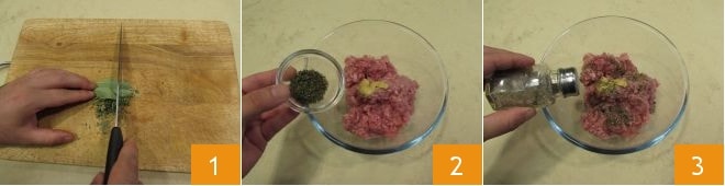 To prepare the turkey burgers, start with the aromatic herb mix: rosemary, oregano, and thyme 1. In a bowl, combine the ground meat with the mustard and the herb mixture 2; season with salt and pepper 3.