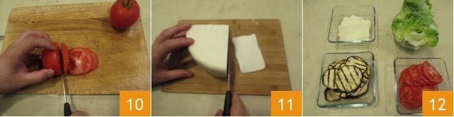 Lastly, wash the tomato and, after removing the stem, slice it like the eggplants, into 1/4 inch thick slices 10, and do the same with the cheese 11. At this point, all your ingredients are ready 12,