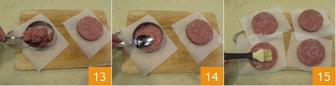 you just need to move to the composition of the patties. Retrieve the ground meat from the fridge and place it inside an 11 cm round pastry cutter placed on a sheet of parchment paper 13. Then, use the back of a spoon to level the surface and make it smooth 14 and brush each burger with a little oil 15.