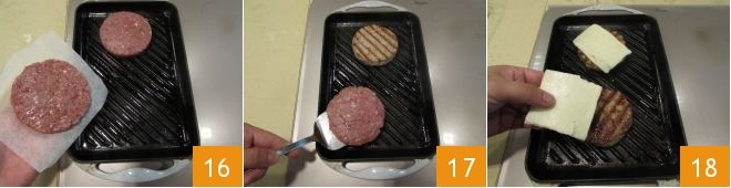 Place the meat patties on the hot grill 16, and after 4 minutes of cooking, flip them with a spatula to cook the other side for the same time 17. Finally, place slices of Pecorino cheese on one side 18